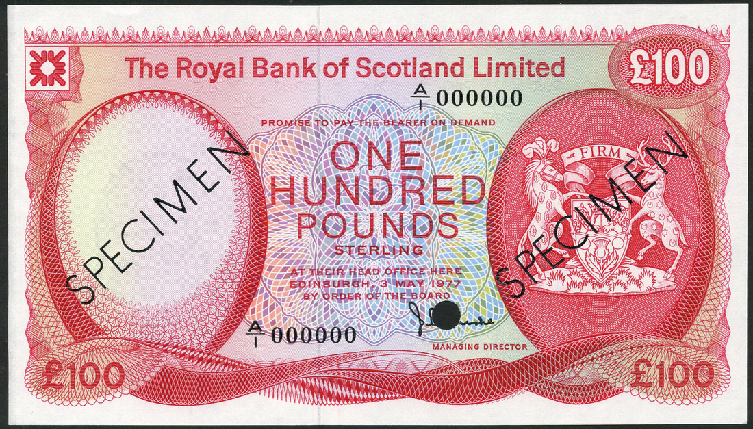 (†) Royal Bank of Scotland, specimen £20, 3 May 1977, serial number A/1 000000, purple and multicoloured, arms at right, reverse Brodick castle; also specimen £100, 3 May 1977, serial number A/1 000000, red and multicoloured, arms at right, reverse Balmoral castle, overprinted SPECIMEN in black on obverse and reverse, one punch hole