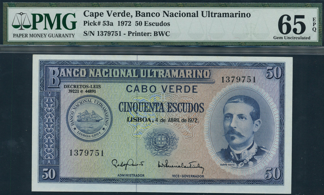 Banco Nacional Ultramarino, Cape Verde, 50 Escudos, 1972, serial number 1379751, blue on multicolour underprint, steamship seal at left, portrait of Serpa pinto at right, arms at centre