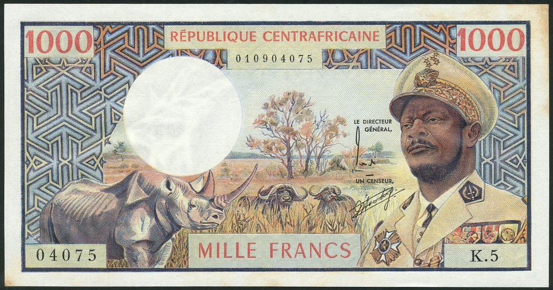 Central African Republic, 1000 francs, 1974, serial number K.5 04075 010904075, multicolour, President Jean-Bedel Bokassa at right, savannah in background with rhinoceros and buffalo