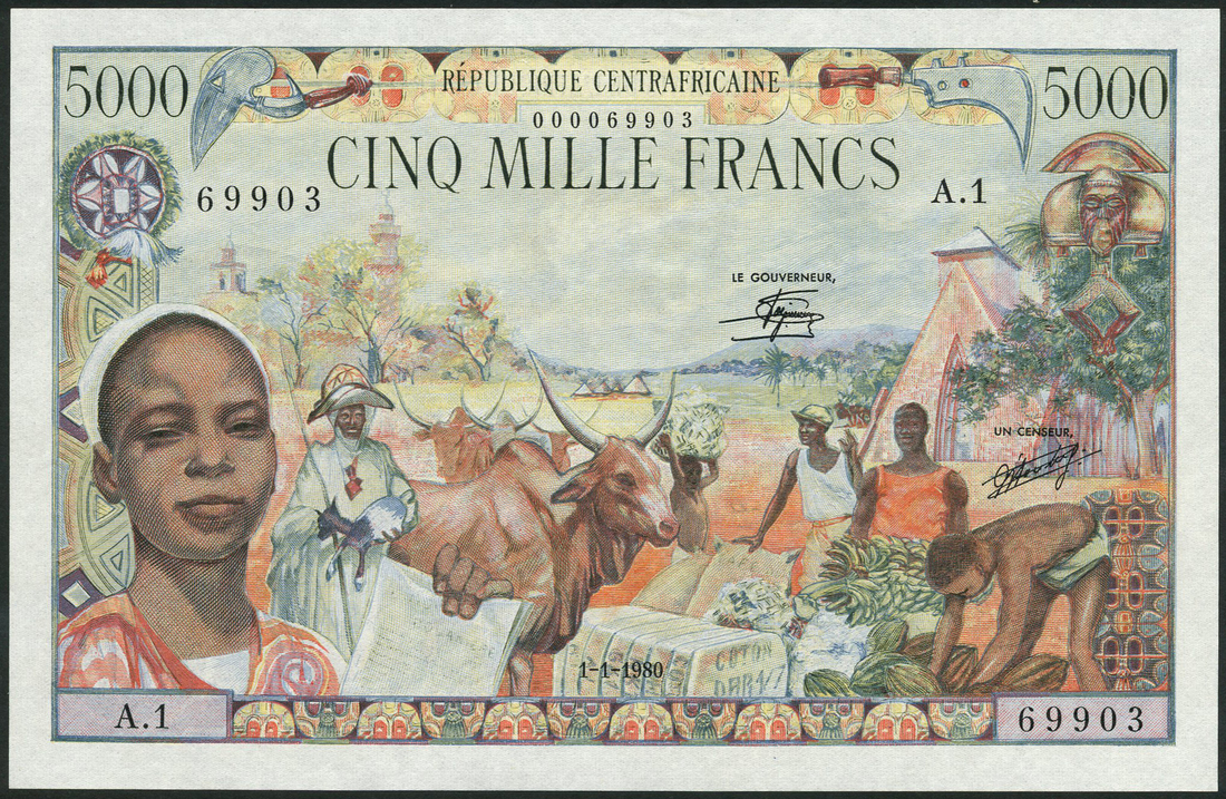 Central African Republic, 5,000 francs, 1 January 1980, serial number A.1 000069903, multicolour, girl with document, man with goat kid and cattle, and farmers holding several crops