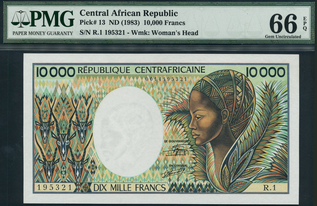 Central African Republic, 10,000 francs, ND (1983), serial number R.1 0014195321, green on multicolour, five antelope heads at left, women at right