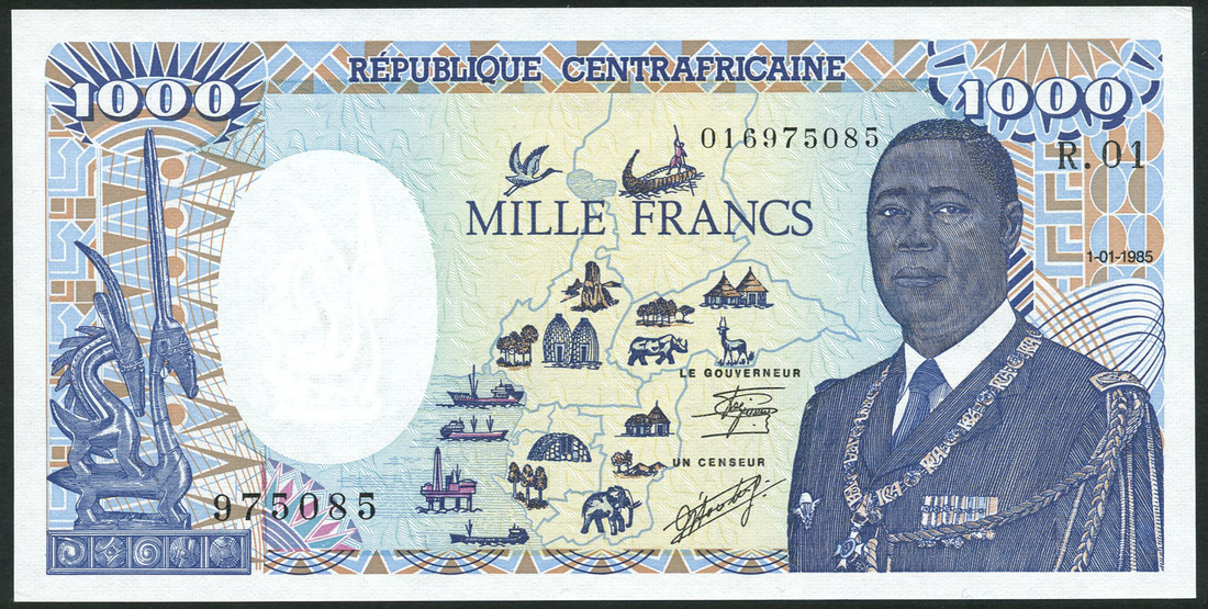 Central African Republic, 1000 francs, 1 January 1985, serial number R.01 016975085, blue and tan, President Andre Kolingba at right, map in background with various icons and symbols, reverse blue and violet, African elephant at left