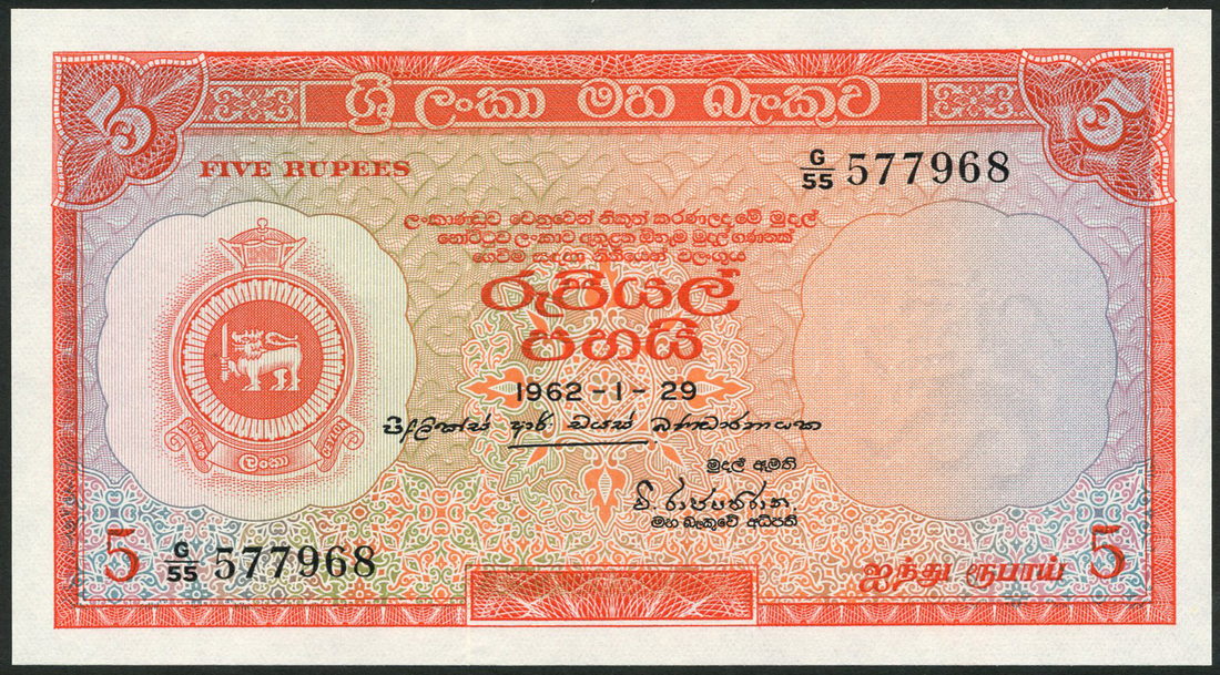 Central Bank of Ceylon, 5 rupees, 29 January 1962, serial number G/55 577968, red on multicolour underprint, coat of arms at left, reverse orange and green, statue of Parakramabahu the Great at centre