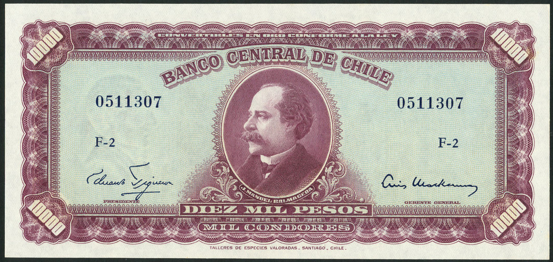 Banco Central de Chile, 20 pesos, 1947, 500 pesos (2), ND (1947-59, 1960-61), 10000 pesos, ND (1960-61), serial numbers C14 025934, A6-100 0809919, A7-101 0047260 and F-2 0511307, brown and light brown, bluish grey, blue and maroon respectively