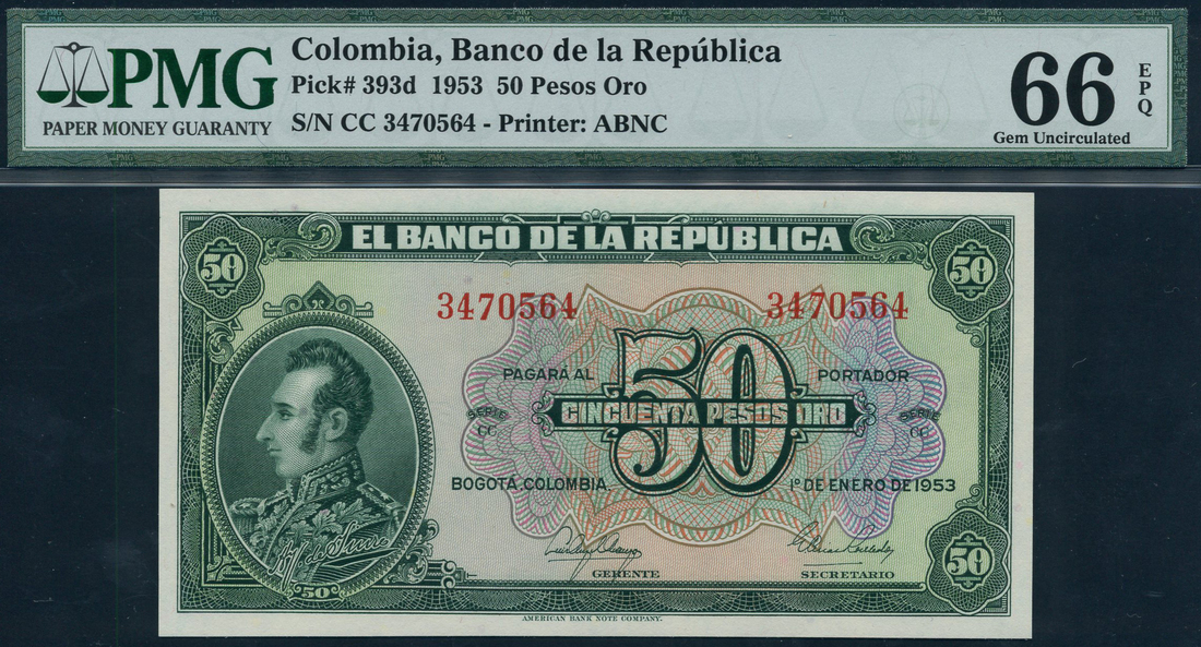 El Banco de Republica, Colombia, 50 pesos, 1953, serial number CC 3470564, 5 pesos, 1953, serial number 32358698, green and olive green respectively, the 50 pesos featuring portrait of General Santander at right and the 5 pesos with portrait of Cordoba