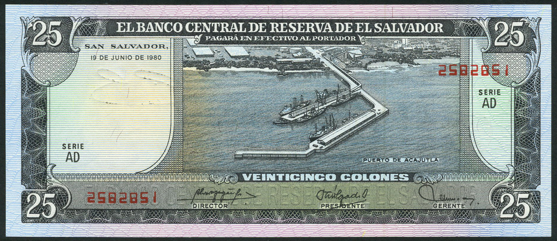 Banco Central de Reserva, El Salvador, 25 colones, 1980, serial number 2582851, blue-grey on light pastel underprint, aerial view of Acajutla port, bank title top centre, ornate border with value in each corner and at centre, reverse, blue, portrait Christopher Columbus in elaborate circular panel at centre