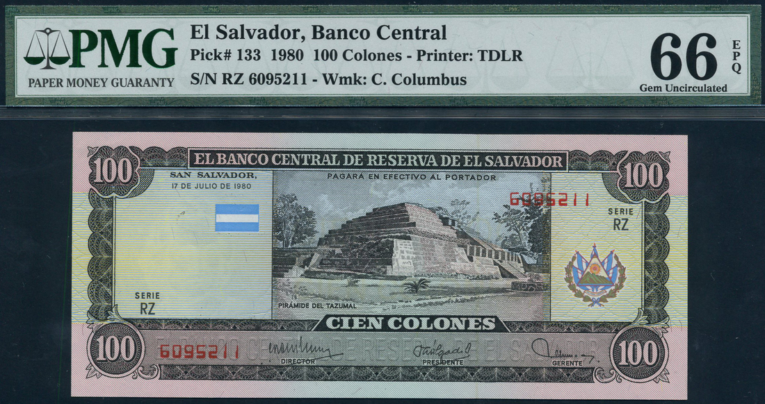 Banco Central de Reserva, El Salvador, 100 colones, 1980, serial number 6095211, blue-grey on light pastel underprint, Indian temple at Tazumal, bank title top centre, ornate border with value in each corner and at centre, reverse, green and lilac, portrait Christopher Columbus in elaborate circular panel at centre flanked by value