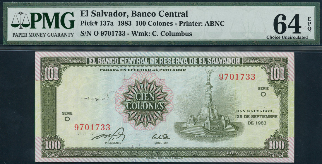 Banco Central de Reserva, El Salvador, 100 colones (2), 1983 and 1996, serial numbers 9701733 and Z/1 002974, first, olive green and light pink, monument at right, bank title top centre, ornate border with value in each corner and at centre, second, bright blue on pink and green underprint, Indian temple at Tazumal at centre, reverses, portrait Christopher Columbus in elaborate circular panel at centre