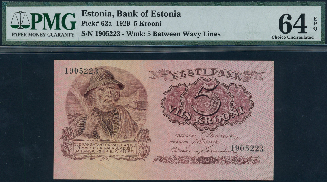 Bank of Estonia, 5 krooni, 1929, serial number 1905223, maroon on light pink underprint, fisherman holding oar at left, bank title top centre right with value in ornate tablet below, reverse, bright multicolour, arms at left, value below and at centre right