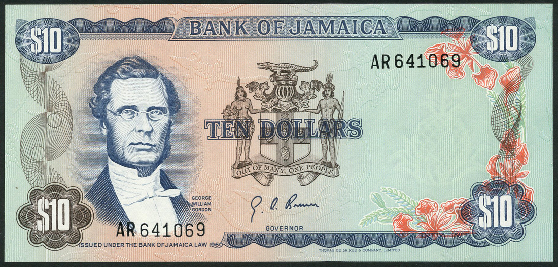 Bank of Jamaica, $10, ND (1976-77), serial number AR 641069, dark blue on pale orange and green, portrait William George Gordon at left, coat of arms at centre, flowers far right, value in each corner and at centre, reverse, bauxite industry site