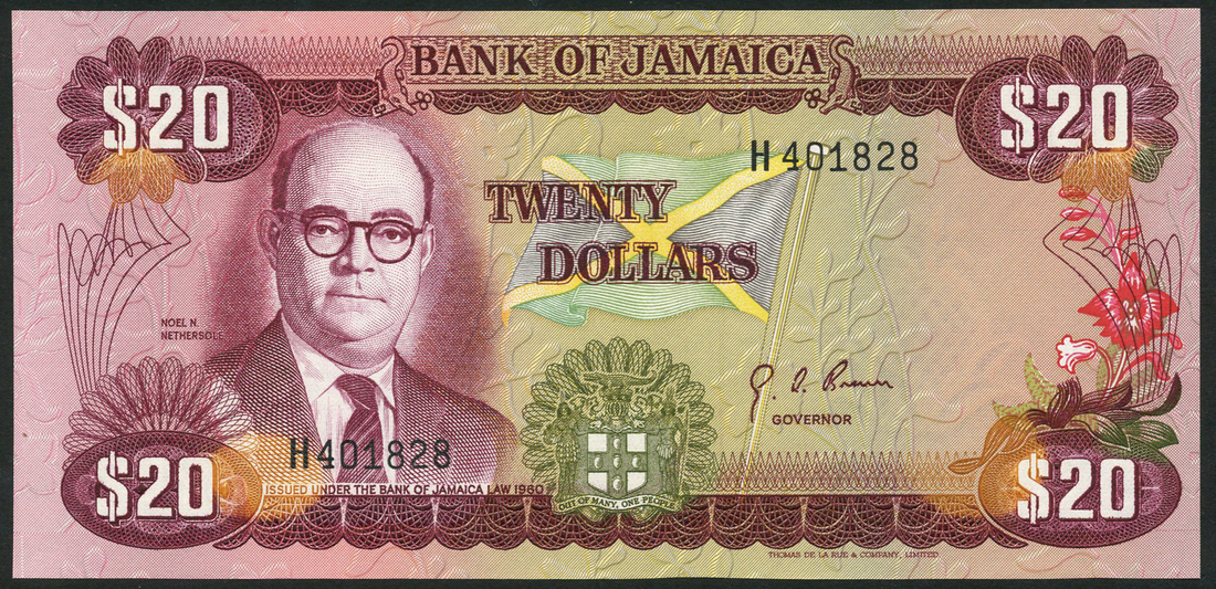 Bank of Jamaica, $20, ND (1977), serial number H 401828, maroon and multicolour, portrait Noel N Nethersoll at left, bank title top centre, coat of arms low centre, value in each corner and at centre, flowers at right, reverse, Bank of Jamaica