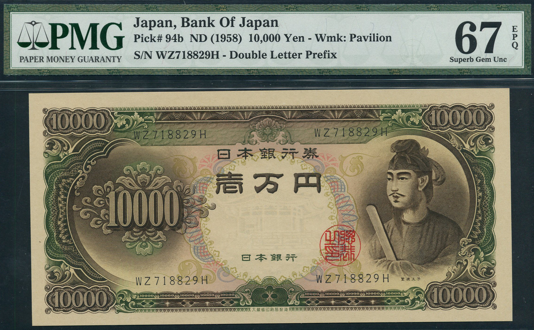 Bank of Japan, 10000 yen, ND (1958), serial number WZ718829H, brown and green on multicolour underprint, portrait at right, ornate border with value at each corner and at centre, reverse, elaborate pattern in dark brown and pastel colours