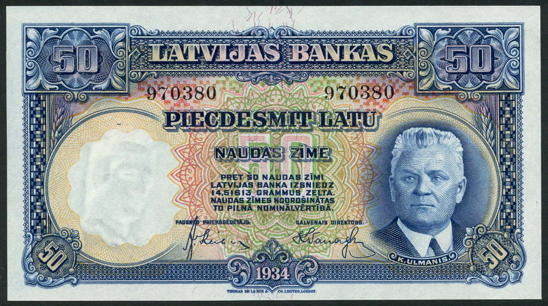 Latvia Bank, 50 latu and 20 latu, 1938, serial numbers 970380 and A941,170, first, green and mauve, statue at right, bank title top centre, value in each corner, reverse, river at centre, coat of arms at left, second, blue and multicolour, portrait K Ulmanis at right, value in each corner and at centre, reverse, coat of arms in ornate panel top centre
