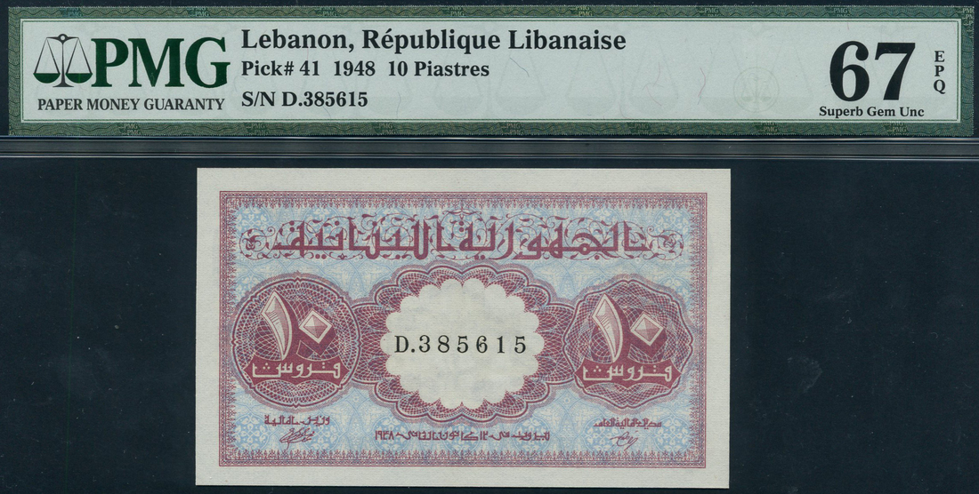 Republique Libanaise, Lebanon, 10 piastres, 21 January 1948, serial number D.385615, maroon and light blue, serial number at centre of geometric pattern with value at either side, reverse, boats at shoreline, building in background