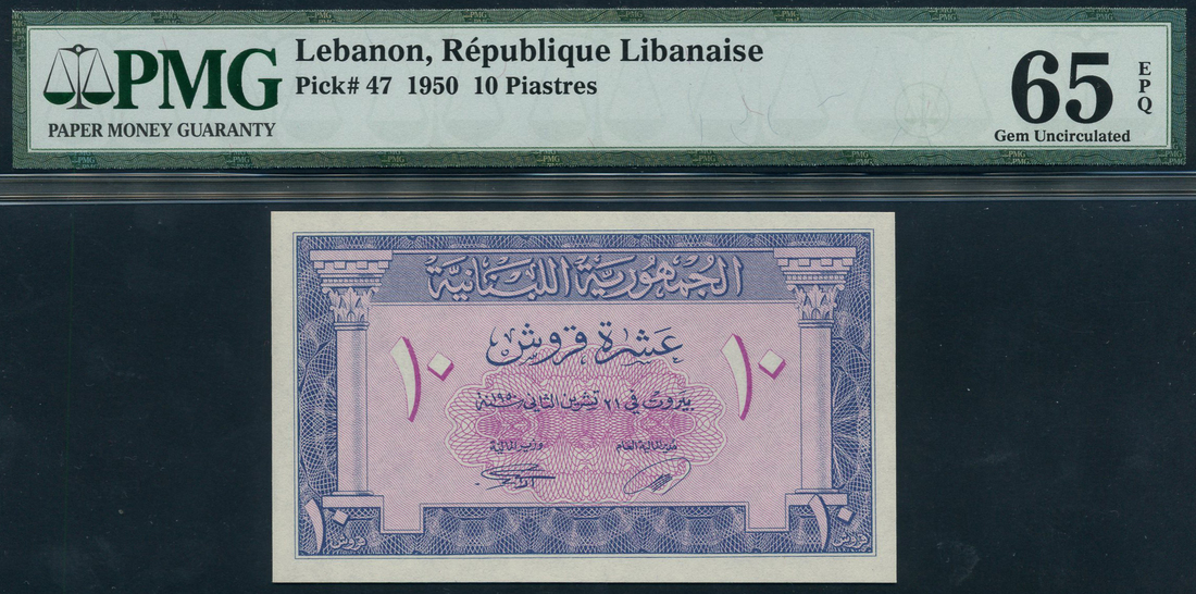 Republique Libanaise, Lebanon, 10 piastres, 1950, no serial number, violet and light pink, columns at left and right, reverse, Palais Beit-ed-Din at centre, bank title top centre and value in each corner, also 1 livre, 1963, serial number P31 51876, brown, pale blue and light yellow, rowing boats, Crusader Castle at Saida in background, reverse, columns of Baalbeck