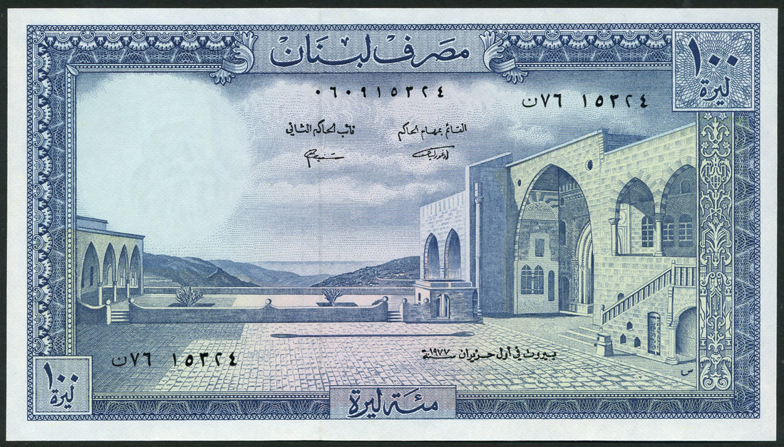 Banque du Liban, Lebanon, 10 livres, 1971, serial number W19 78108, 100 livres, 1977, serial number N76 15324, purple on multicolour underprint, ruins of Anjar at centre, reverse, large rocks and blue, light green and pale pink, Palais-ed-Di, reverse, cedar trees, respectively