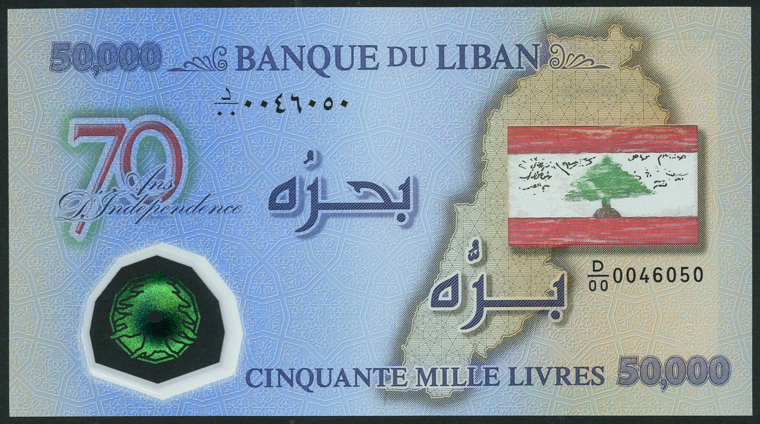 Banque du Liban, Lebanon, 50000 livres (2), 2013, consecutive serial numbers D/00 0046049/50, blue and multicolour, map at right, bank title top centre, value top left, low right and in text low centre, reverse, building at left