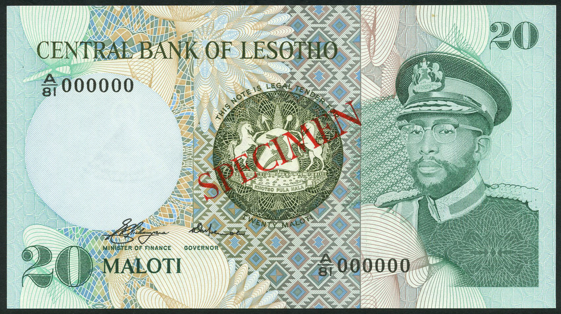 Central Bank of Lesotho, specimen 5 maloti, 20 maloti, 1981, serial numbers A/81 000000 and A/81 000000, dark blue on multicolour underprint and green on multicolour underprint respectively, portrait King Moshoeshoe II at right, coat of arms at centre, reverse, waterfall on 5 and cattle with herder on 20