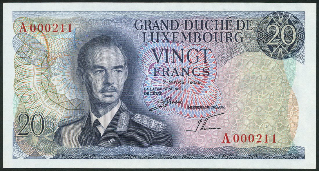 Grand-Duche de Luxembourg, 20 francs, 1966, serial number A 000211, dark blue on multicolour underprint, portrait Grand Duke Jean at centre left, value low left, centre and top right, reverse, Moselle River