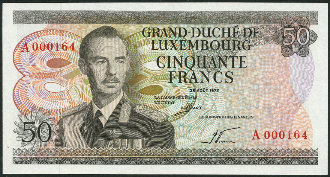 Grand-Duche de Luxembourg, 50 francs, 19072, serial number A 000164, brown on multicolour underprint, portrait Grand Duke Jean at centre left, ornate border top and low margin, bank title top centre right, reverse, factory scene