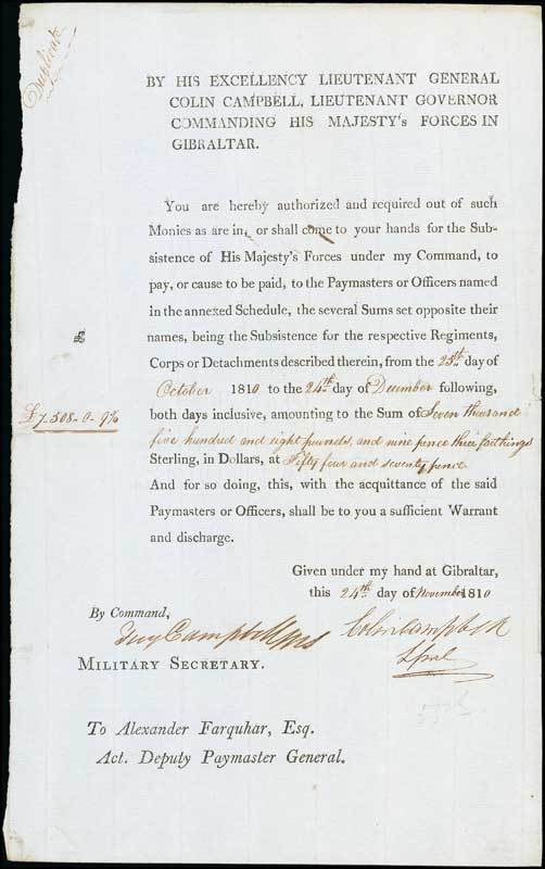 1810 (24 Nov.) "Duplicate" order for the payment of £7,508.0.9¾, for two months expenses, "being the Subsistence for the respective Regiments, Corps or Detachments described therein". Black printing with manuscript annotations and signature of General Colin Campbell. Size 8" x 13". Horizontal folding creases, fresh. Photo