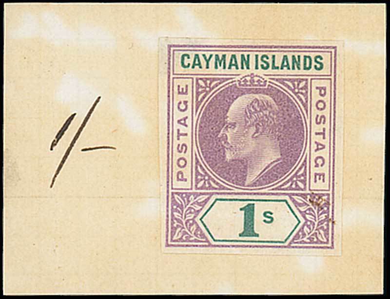 1/- in violet and green, affixed to piece with manuscript "1/-" alongside, the issued colours; small mark at right and corner crease at lower left. Photo