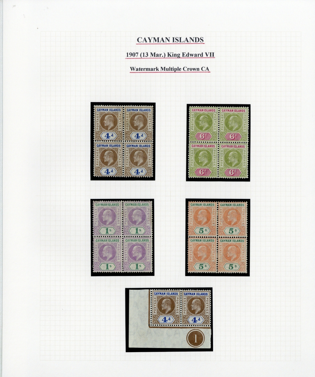 4d. to 5/- set of four in mint blocks of four with additional 4d. lower left corner pair with plate number; all folded between horizontally, 1/- block pale, otherwise fine mint. S.G. 13-16, £1,270+