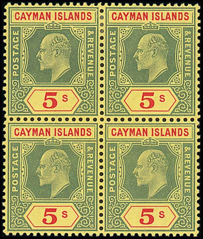 5/- green and red on yellow block of four, the upper left stamp with the flaw, fine mint. S.G. 32. Photo
