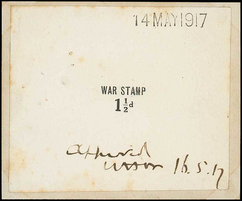 1917 (Sept.) die proof of the Type 16 surcharge in black on wove paper (64x53mm.), dated "14 may 1917" and endorsed "Approved WHM 16.5.17", affixed to card (70x58mm.); some pinholes at upper left and trivial ageing. Photo