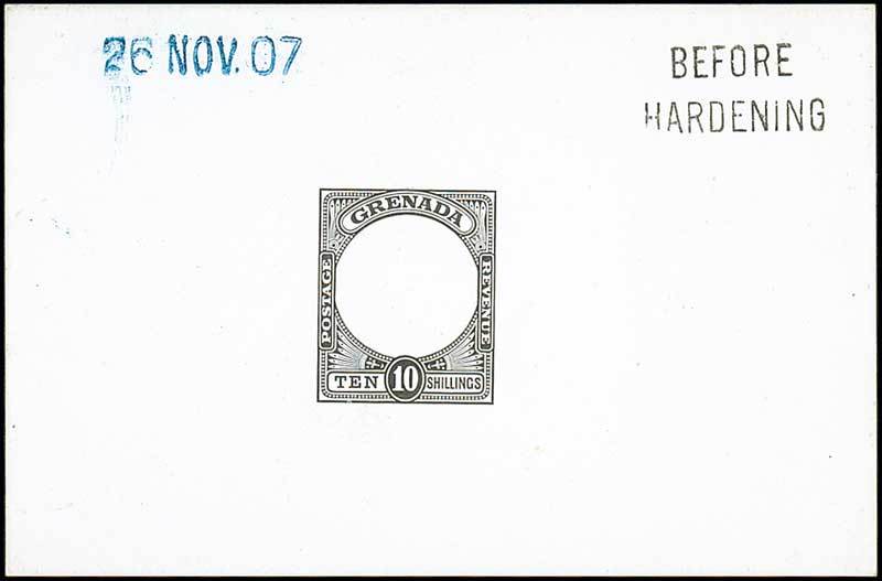 die proof: 1908 10/- frame in black on glazed card (92x60mm.), marked "before hardening" and dated "26 nov. 07". Photo