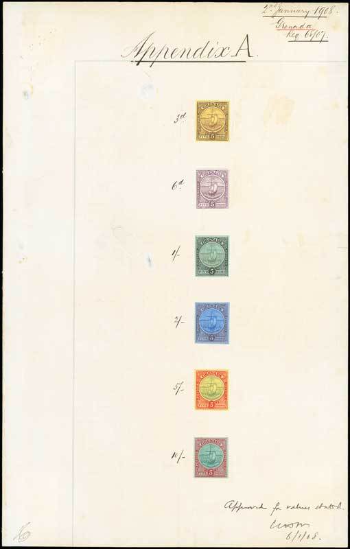 imperforate colour trials: 5/- (6) in the issued colours of the 3d., 6d., 1/-, 2/-, 5/- and 10/-, affixed to 1908 (2 Jan.) "Appendix A" sheet (222x320mm.) with the suggested values written alongside each, marked at foot "Approved for values stated WHM 6/1/08". An outstanding group. Photo