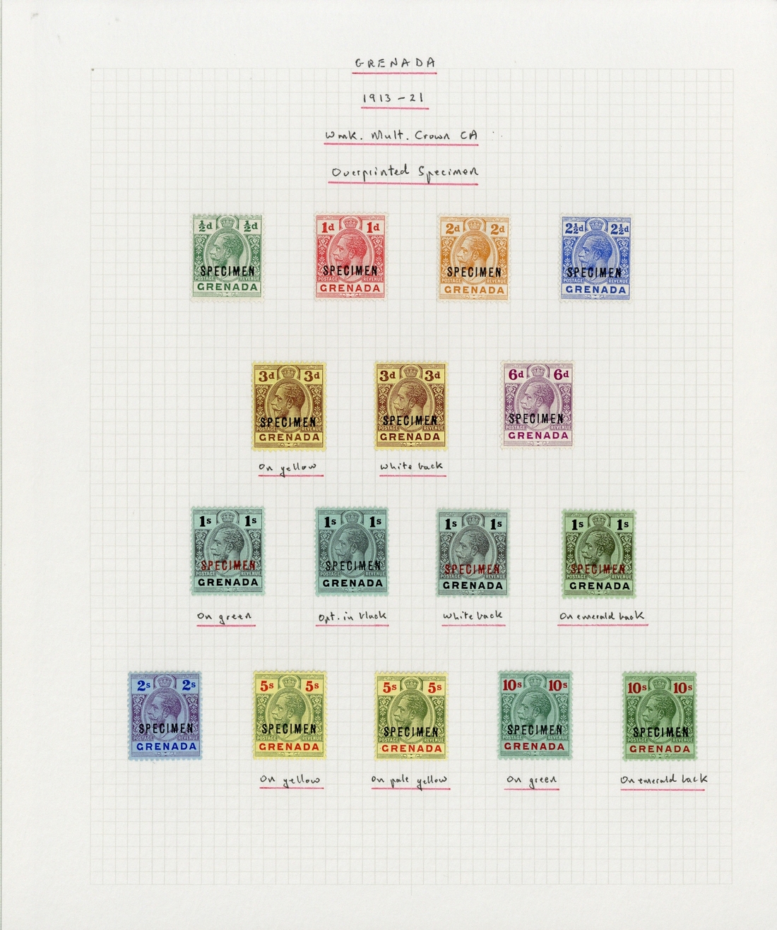 specimen stamps: 1913-22 ½d. to 10/- with the six additional listed paper/overprint varieties, each overprinted "specimen", fine mint. Cat. £473