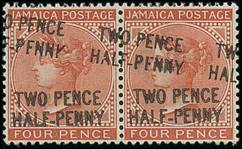 Variety surcharge double, one diagonally horizontal pair, the double surcharges including both "pfnny" for "penny" and broken "k" for "y" varieties, large part original gum, surcharge double" unused without gum, and surcharge triple with part original gum (toned). B.P.A. Certificate (2007) for each. S.G. 30 group. Photo