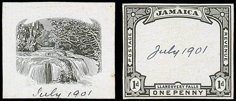 1901 1d. frame and vignette, both stamp-size in black on wove paper, both dated "July 1901". Photo