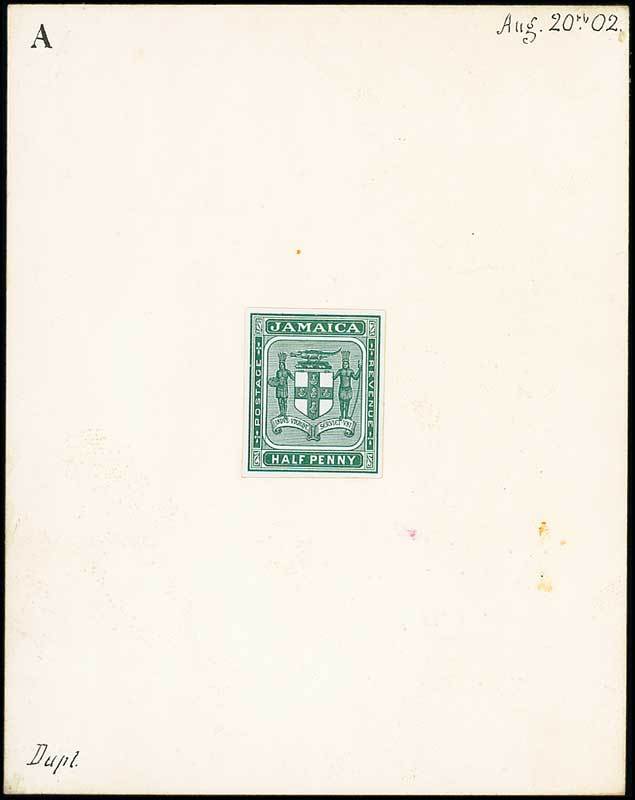 ½d. printed in green, stamp-size on highly surfaced thin card, affixed to card (90x114mm.) lettered "A", marked "Dupl." and dated "Aug. 20th. 02.". Unique. Photo