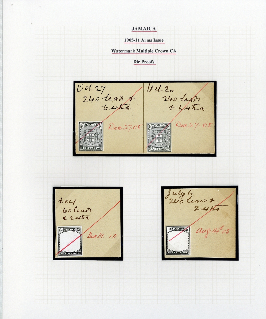 ½d., 1d. and frames of the 6d. and 5/-, all stamp-size and affixed to three De La Rue day book pieces giving dates and details of leads taken, all subsequently crossed through in red ink and redated in 1905 or 1910 (6d.). A unique group