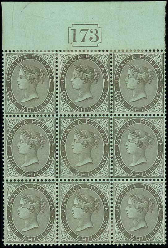 1/- black on green chalk-surfaced paper marginal block of nine from the top of the sheet with current number "173", the centre stamp with variety "$" for "s" in "shilling", mint with a few hinge remainders, none of which affect the variety which is apparently unmounted. A fine and impressive positional multiple of this popular variety. B.P.A. Certificate (2007). S.G. 54, 54a, £1,000+. Photo
