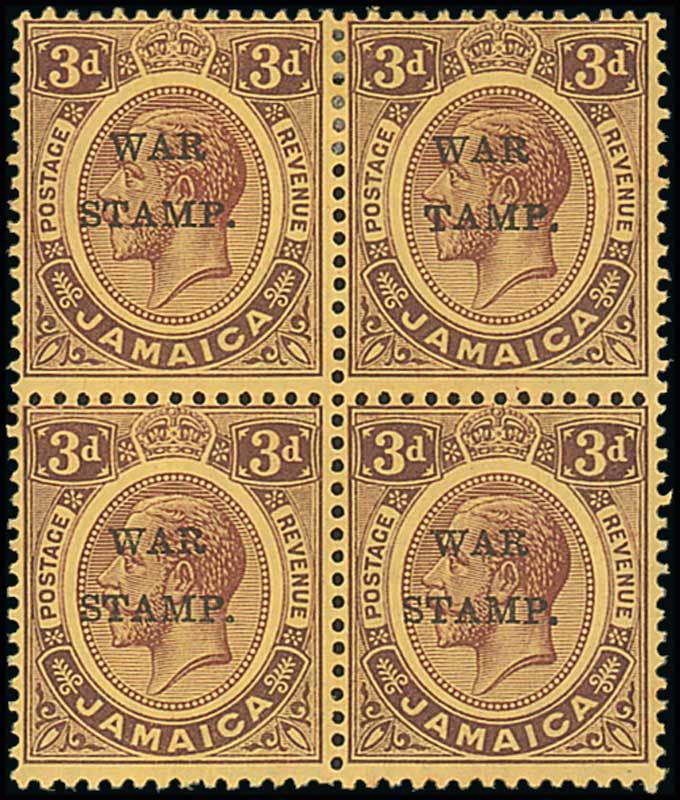 1916 (Sept.-Dec.) 3d. purple on lemon block of four, the upper right stamp variety "s" of "stamp" omitted, fine mint. Scarce. B.P.A. Certificate (2007). S.G. 72/b, £850+. Photo