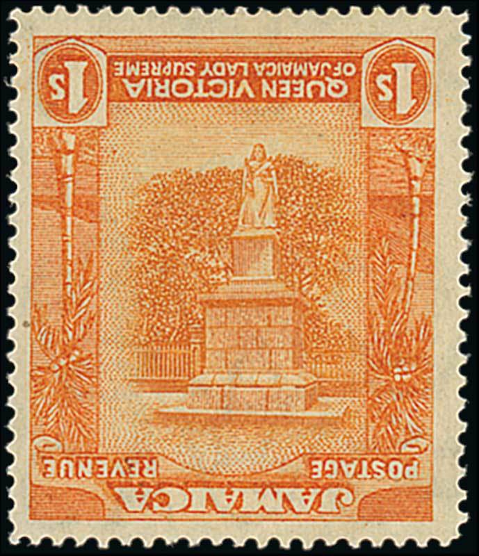 Note: According to most accounts, this frame inverted variety was discovered by a local collector at the small Post Office in Manchioneal (a village on the coast) in March 1922. It is presumed that only one sheet of sixty must have been printed, with half the sheet going to Manchioneal and some being fiscally used, while, more than likely, the other half sheet went to Kingston, as a used example of the error exists with a Kingston cancellation. Estimates vary among specialists as to the exact numbers of these errors that still exist, but the number is believed to be between 10 and 20 only