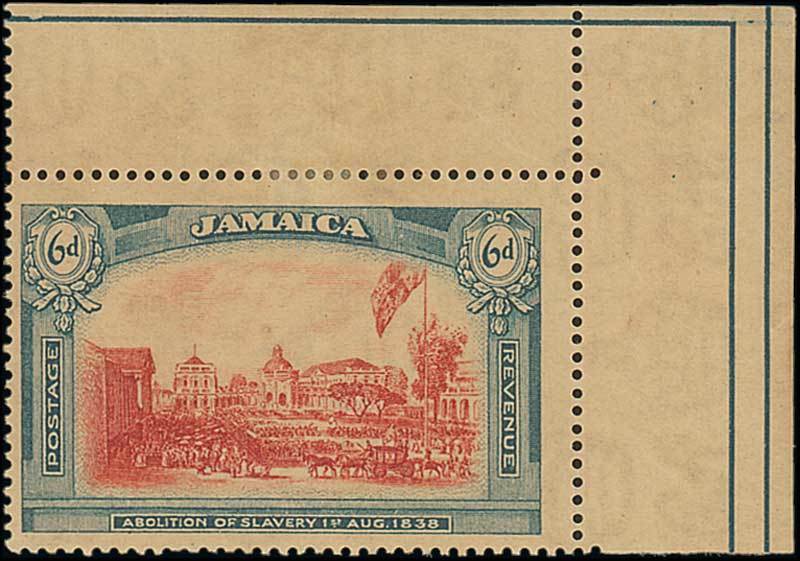 Note: It was considered politically inexpedient to have the suggested "Abolition of Slavery" stamps issued and when the first two printings reached Jamaica on 11 May 1921 they were destroyed. The Crown Agents were also instructed to destroy the unissued supply held by them. A third printing reached Jamaica in October 1921 and was also destroyed except for two blocks of four on Script paper. One corner block of four resides in the Royal Philatelic collection. The other was broken up and now resides in private collections