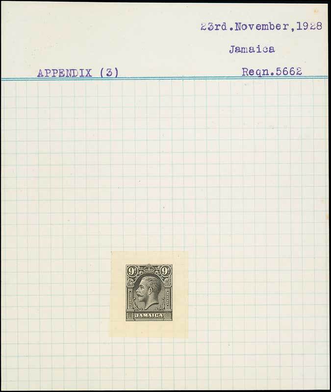 9d. in black on surfaced wove paper and affixed to De La Rue "Appendix (3)" piece (122x145mm.) marked "Reqn. 5662" and dated "23rd. November 1928". Photo