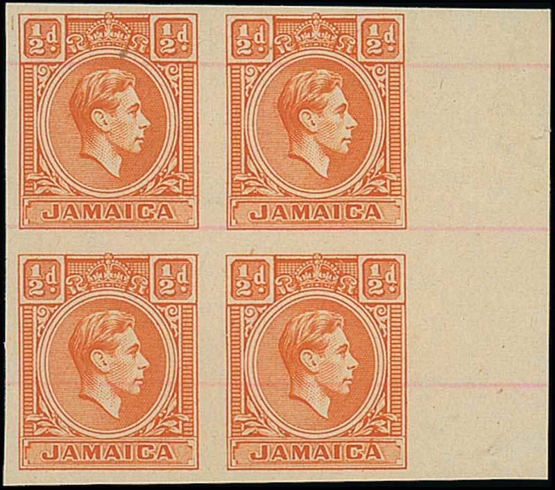 1951 ½d. orange imperforate plate proof marginal block of four on unwatermarked paper with ruled horizontal lines in pink; believed to be unique as a block. Photo