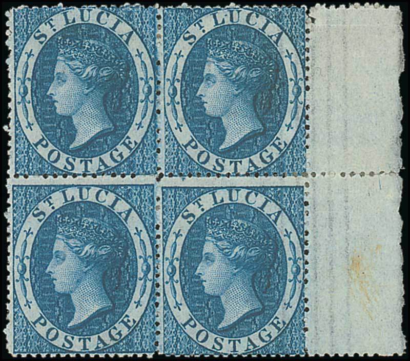 (4d.) blue marginal block of four from the right of the sheet, rich colour and with large part original gum; fine and attractive. B.P.A. Certificate (2007). S.G. 2, £900. Photo