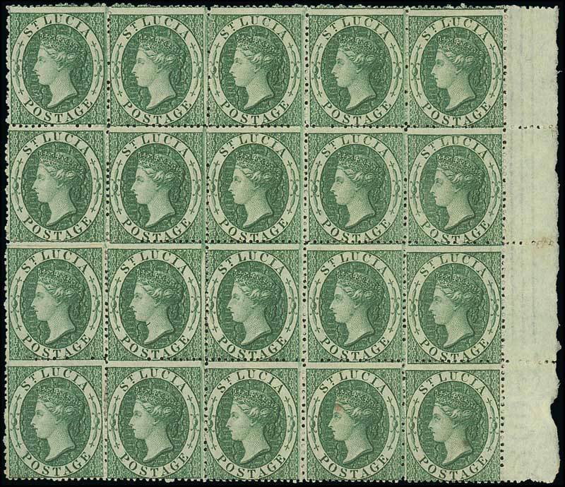 (6d.) green marginal block of twenty (5x4) from the right of the sheet, large part original gum; light crease through row three, otherwise fine. B.P.A. Certificate (2007). S.G. 3, £6,000. Photo
