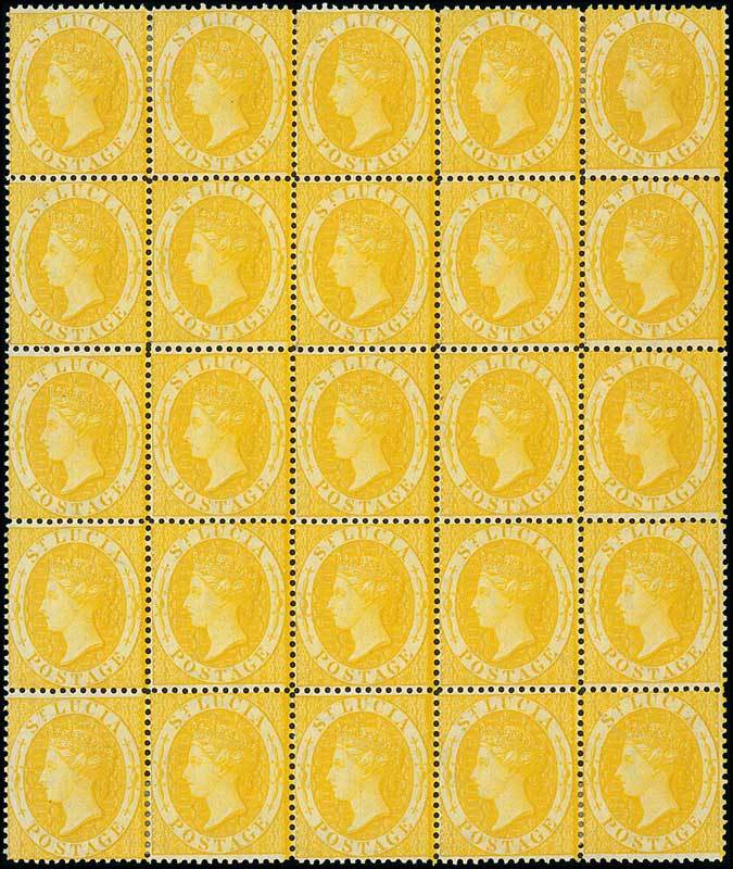 (4d.) yellow block of twenty-five, fresh with large part original gum, the centre block of nine unmounted; fine and an impressive multiple. B.P.A. Certificate (2007). S.G. 16. Photo