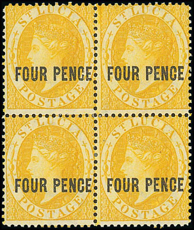 4d. yellow block of four with large part original gum, fresh colour; one with a thin spot, otherwise fine. B.P.A. Certificate (2007). S.G. 27, £1,200. Photo