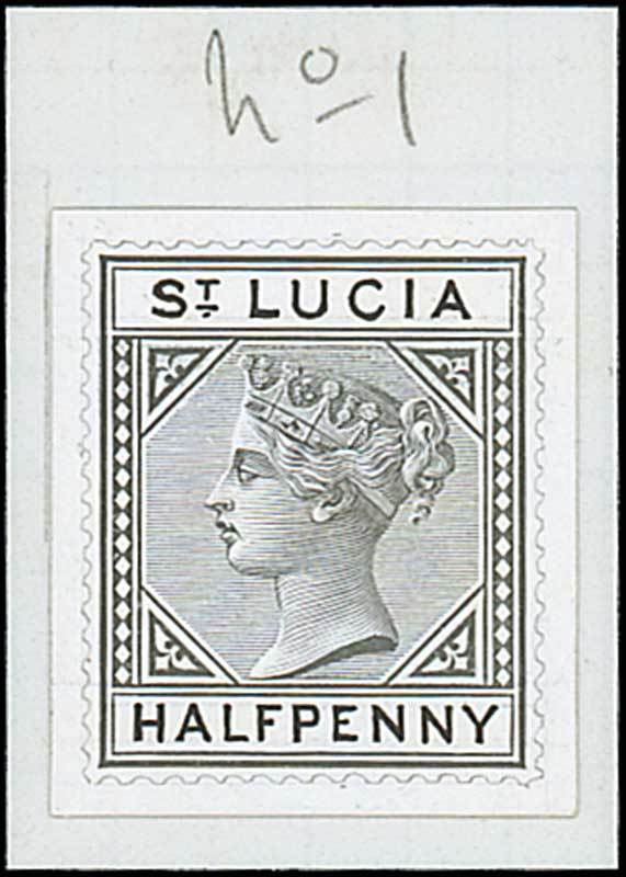 Master die proof in black on glazed card, stamp-size with handpainted country name and "half-penny" tablets and with simulated perforations in pencil, affixed to small piece marked "No 1". Very fine. Photo