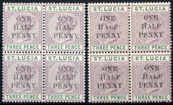 1891-92 ½d. on 3d. Die I and II blocks of four, the latter centred to lower right, fine mint. S.G. 53, 56, £940