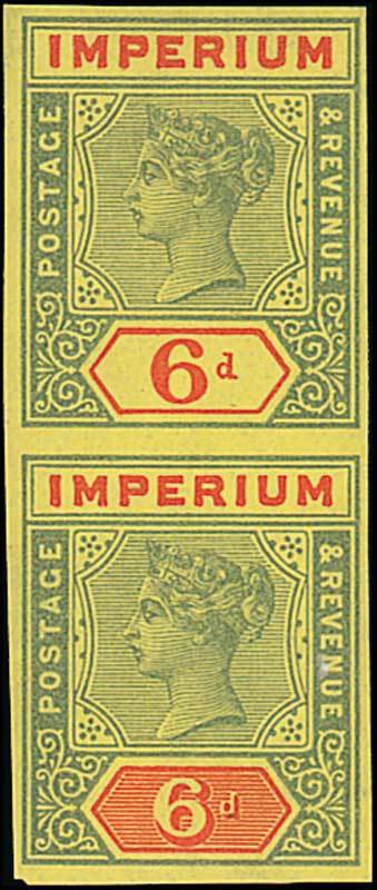 1897 Imperium Postage & Revenue vertical pair in green and red on yellow CA watermarked paper and showing unshaded and shaded value tablets se-tenant, part original gum and with paper adherences; lower proof with tiny thin, otherwise fresh and fine. Photo