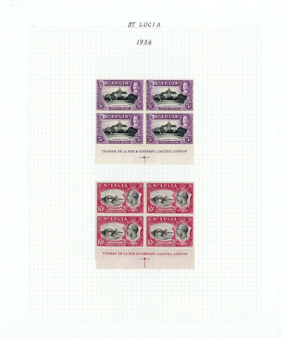 1936 ½d. to 10/- set of twelve in imprint blocks of four or eight (vertical format stamps) and 1½d. perf. 12x13 block of four, fresh mint; the horizontal format stamps with wrinkles in selvedge. An attractive group. S.G. 113-124, £500+